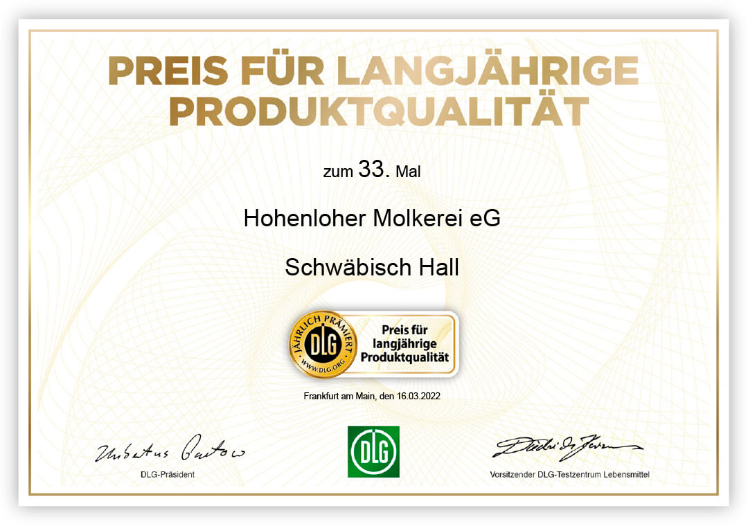„Preis für langjährige Produktqualität“ geehrt. Die Unternehmensauszeichnung steht für konsequentes Qualitätsstreben und wird nur vergeben, wenn Lebensmittel mindestens fünf Jahre regelmäßig und erfolgreich von der DLG getestet wurden.