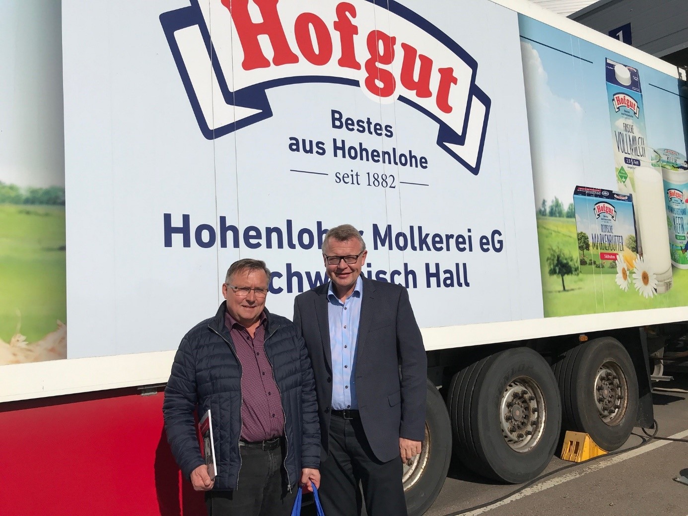 Am 29.03.2019 wurde unser LKW-Fahrer Günter Dierolf nach 41-jähriger Tätigkeit für die Hohenloher Molkerei von Martin Boschet vor einem „seiner“ LKWS verabschiedet. Günter Dierolf hat seinen Beruf mit überaus großem Engagement durchgeführt. Er war immer zu Diensten und ein Garant für Freundlichkeit und Pünktlichkeit gegenüber unseren Kunden. Früher ist Herr Dierolf auch Milchsammelwagen gefahren und hatte so regen Kontakt zu unseren Milchbauern.