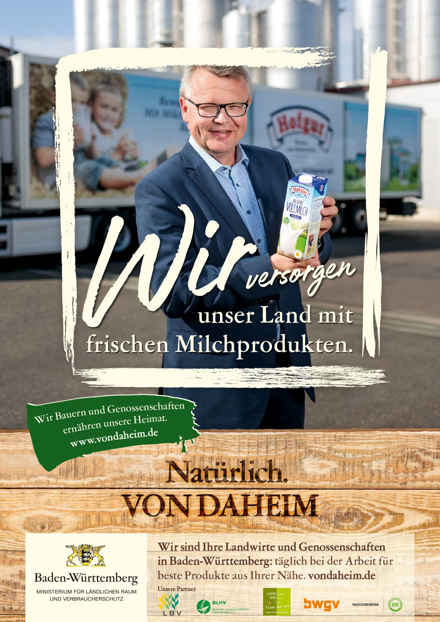 Bereits in Kürze wird die Regionalkampagne auf Bannern und Plakaten im ganzen Land zu sehen sein. Ergänzt wird „Wir versorgen unser Land“ durch Videos, in denen sich die Bauern und Genossenschaften mit ihren Betrieben vorstellen und einen Einblick in ihre Arbeit geben. Diese Filme werden nach und nach auf Facebook, Instagram und auf von-daheim.de veröffentlicht. Ein Clip mit unserem geschäftsführenden Vorstand Martin Boschet gehört ebenfalls zur Serie.